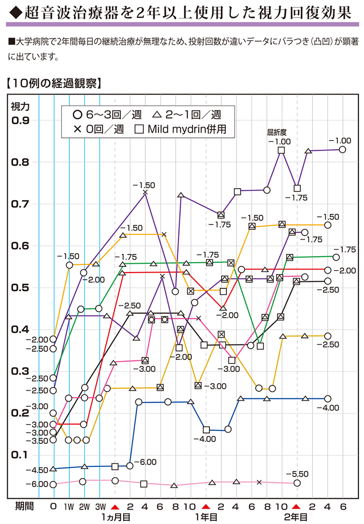 山本博士の研究論文によれば、そのときの博士の臨床実験では、仮性近視および真性近視になって2年以上たっている10歳以上の患者を対象に、1~2日間隔で20回、1回につき10分間、片眼に超音波を投射する治療を行ったといいます。そして結果は、2週間~3週間で視力の向上が見られ、多くの人は第1回投射後ただちに視力が上昇したといいます。